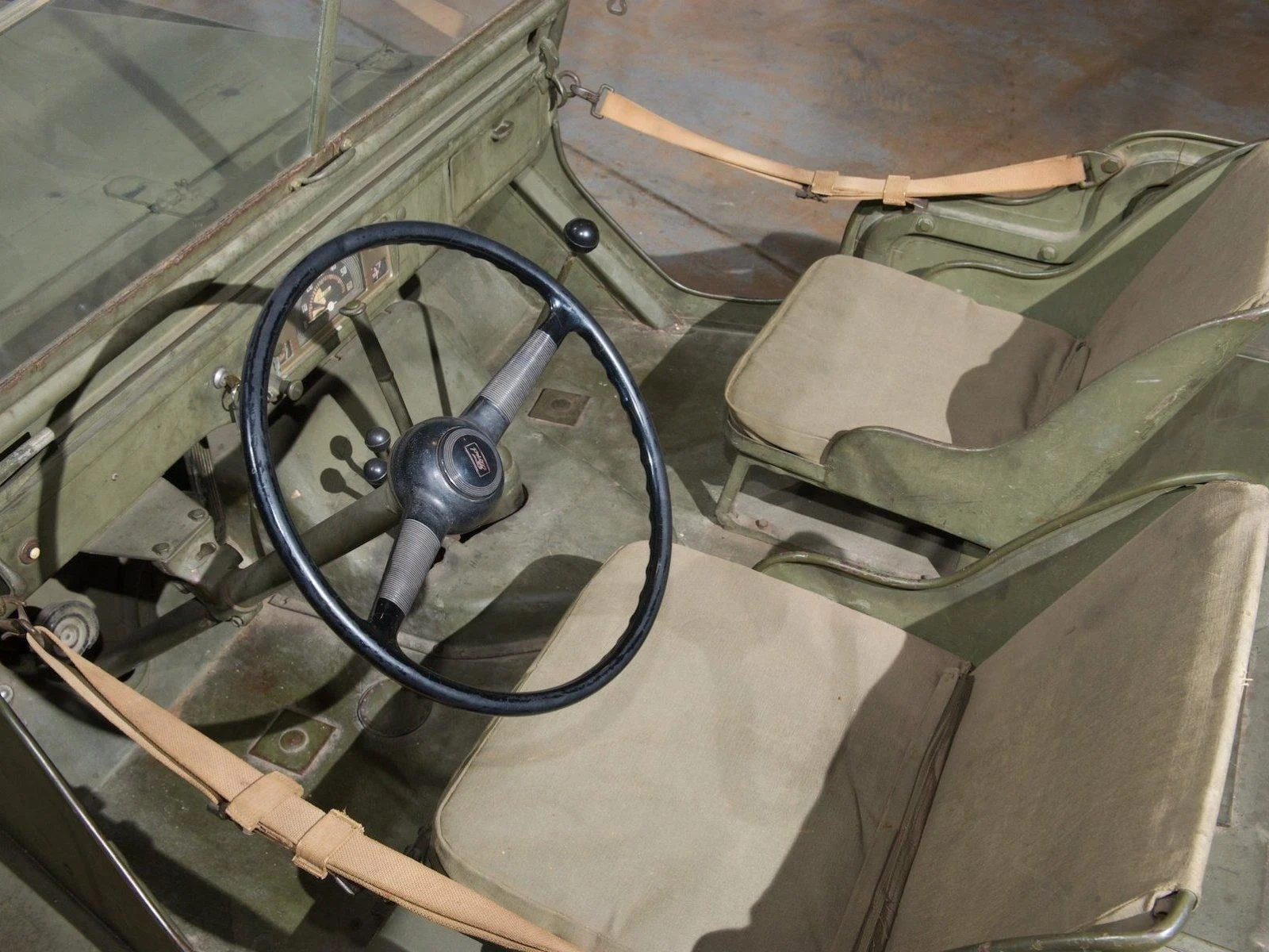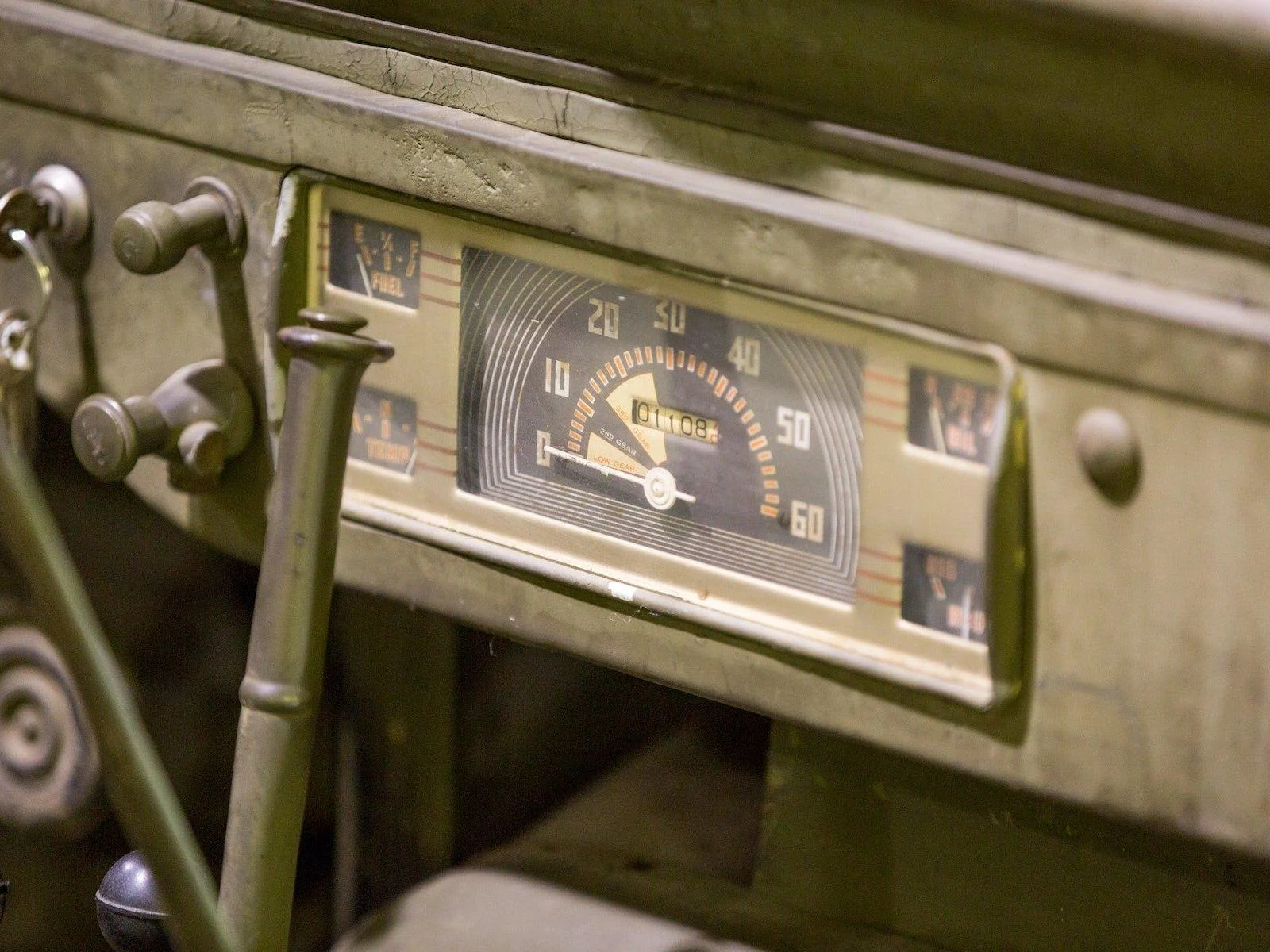 The interior is unrestored and has its original khaki canvas upholstery. There is no carpet and all the surfaces including the dash are painted in the olive drab body color. The instrument cluster is from a Ford truck.