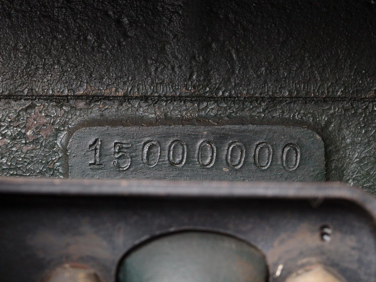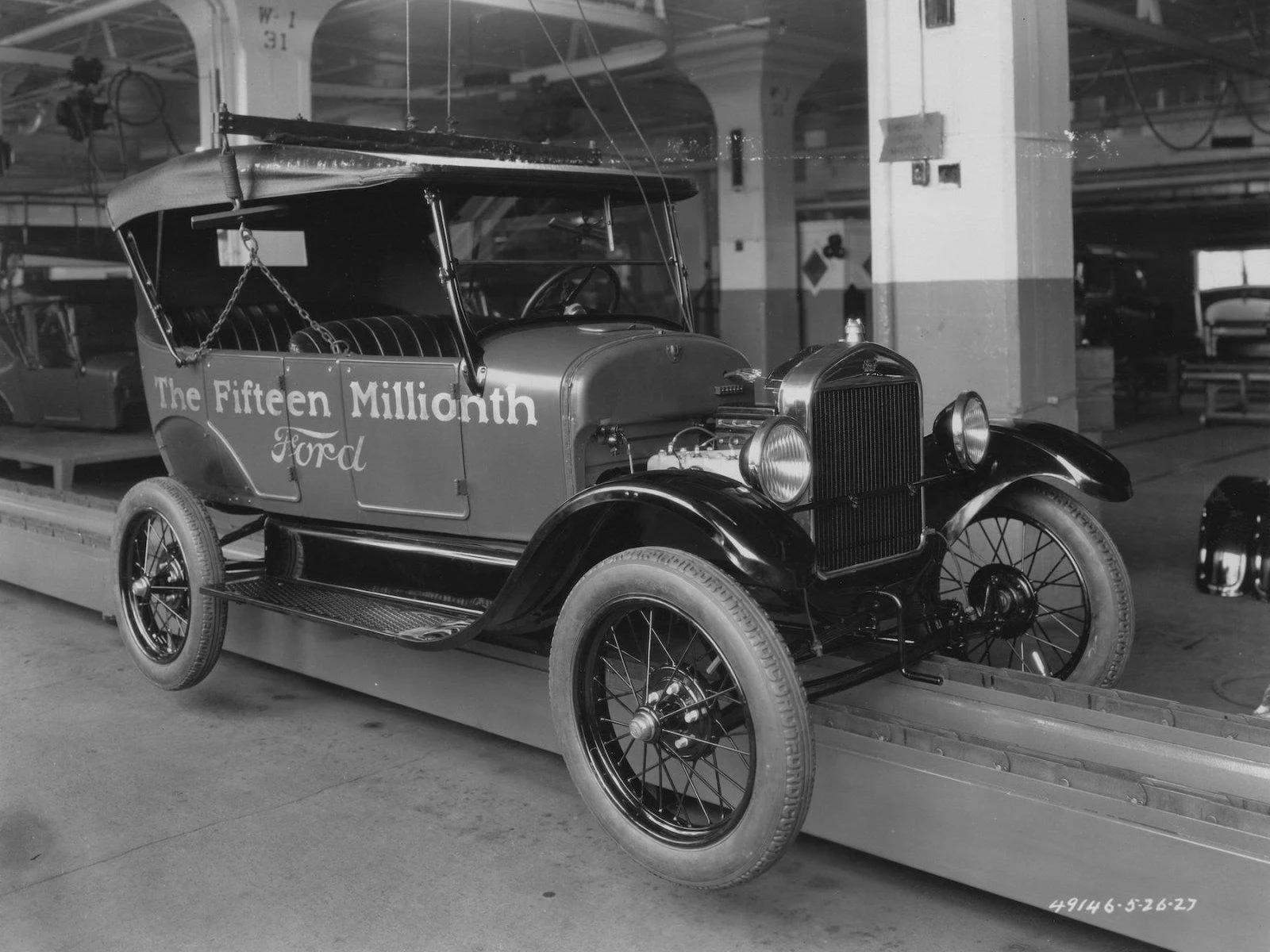 On May 26, 1927, the Ford Motor Company built the fifteen-millionth Ford – a 1927 Model T Touring Car. Its construction celebrated the end of the Model T line, as the company was beginning preparations for the production and sale of the Model A. Each step of the car’s build was documented including its engine numbering. The eight oldest employees from the Ford Motor Company hand stamped a digit on to the specially painted engine block at the Rouge factory. The engine was placed into the chassis at the Highland Park plant where the Model T was completed. The chassis was fitted with a specially lettered Touring Car body painted blue that featured Edsel Ford (Ford Motor Co. President) and Henry Ford (Ford Motor Co. Founder) drove the car out of the plant and to the Engineering Laboratory for press photos.