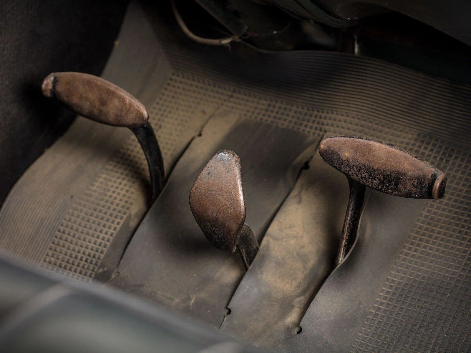 This vehicle’s interior is in mostly unrestored condition. It features black “Ford Leather Cloth” seats. Some portions of the interior have been reupholstered.